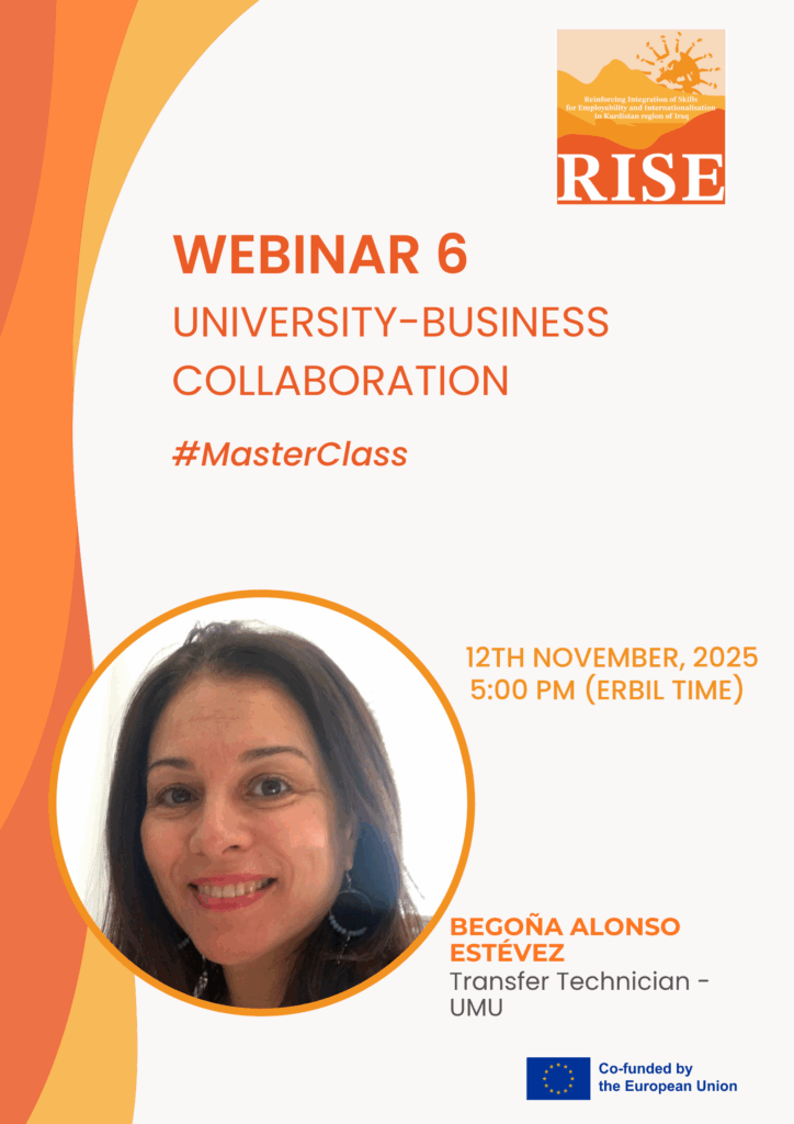 The sixth and last webinar of the RISE MasterClass “University–Business Collaboration” will take place on 12 November 2025, from 3.00 to 4.30 PM (CET) / 5.00 to 6.30 PM (Erbil time), and will focus on how universities can turn research into real-world impact through strategic partnerships with industry. The session will be led by Begoña Alonso Estévez from the Technology Transfer Office (OTRI) of the University of Murcia (UMU).